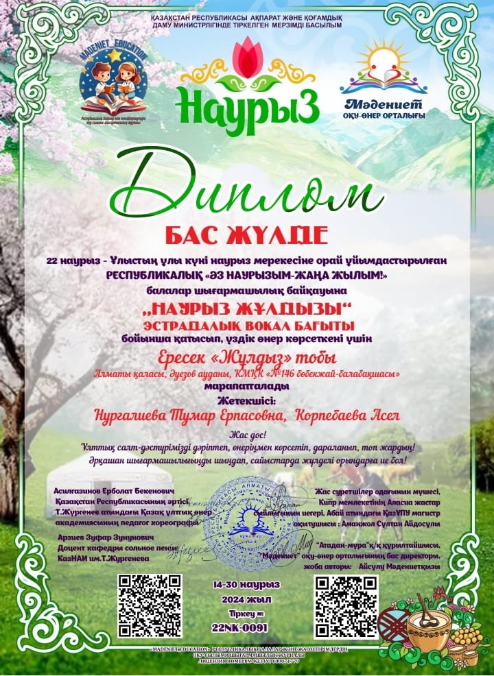 19 март 2024 0 1 2 3 4 5 22 наурыз -Ұлыстың ұлы күні наурыз мерекесіне орай ұйымдастырылған РЕСПУБЛИКАЛЫҚ "ӘЗ НАУРЫЗЫМ-ЖАҢА ЖЫЛЫМ" балалар байқауы.